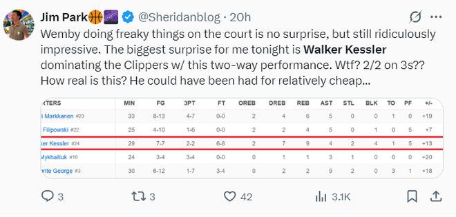 沃克-凱斯勒在揭幕戰VS快船的比賽中,29分鐘,7中7,三分2中2,拿到22分9籃板2搶斷4蓋帽,命中率100%,真實(shí)命中率高達120%,凱斯勒面對祖巴茨是絲毫不怵,關(guān)鍵是他練出了三分投射。